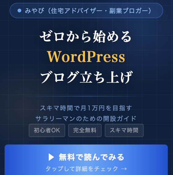 著者:みやび(住宅アドバイザー・副業ブロガー) WordPressをゼロから始めるブログ立ち上げマニュアル スキマ時間で月1万円を目指すサラリーマンのための開設ガイド このマニュアルについて こんにちは、みやびです。このページを見ているあなたは、きっと「ブログを始めてみたいけど、難しそう…」と不安に思っているのではないでしょうか。 私も最初は今日した。専門用語だらけで、何度もパソコンの前で話し合いました。でも、大丈夫です。 このマニュアルは、32歳の普通のサラリーマンである私が、ゼロからブログを立ち上げる ...